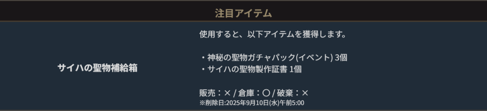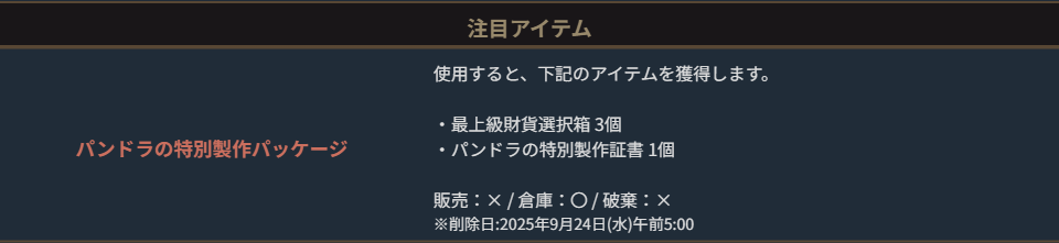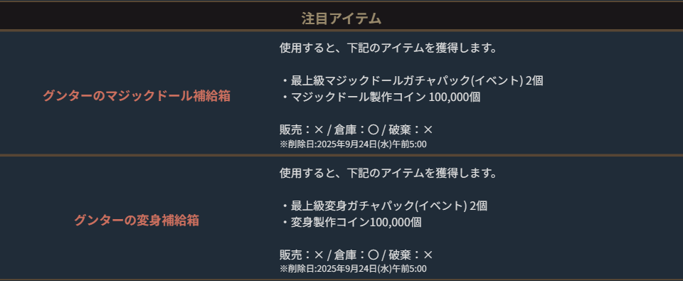 ※一部アイテムは未使用の場合、一定期間が経過すると自動で削除されます。詳しくは各アイテムの詳細をご確認ください。