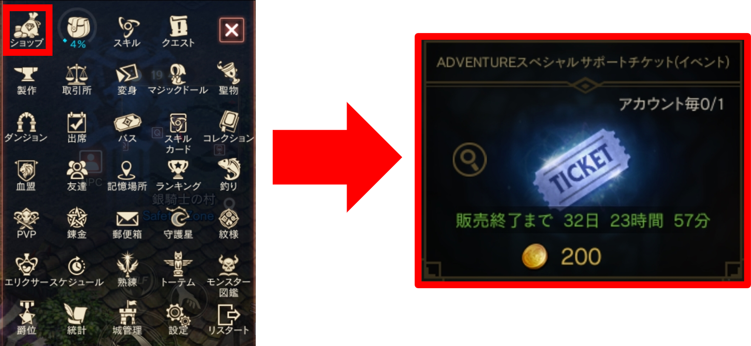 ゲーム内メニューのショップ>イベントにある 「ADVENTUREスペシャルサポートチケット(イベント)」をアデナで交換をしましょう。 製作したアイテムを使用して成長支援のアイテムを入手しましょう。 |