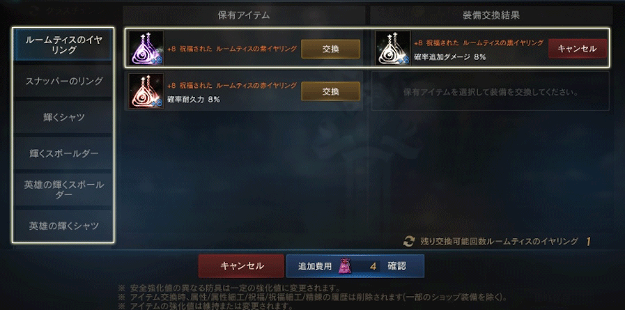 「伝説級スキル(ユニーク)」は別枠となり、伝説級スキル(ユニーク)と伝説級スキルおよび伝説級スキル(血盟ユニーク)間の交換はできません。