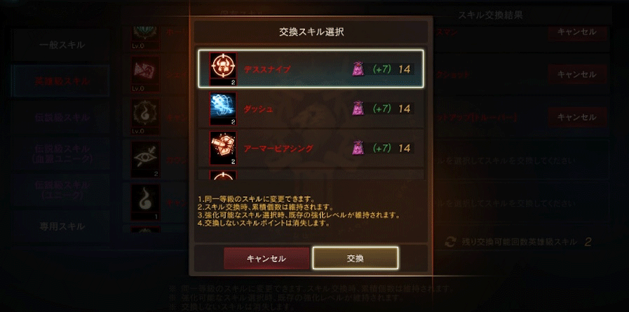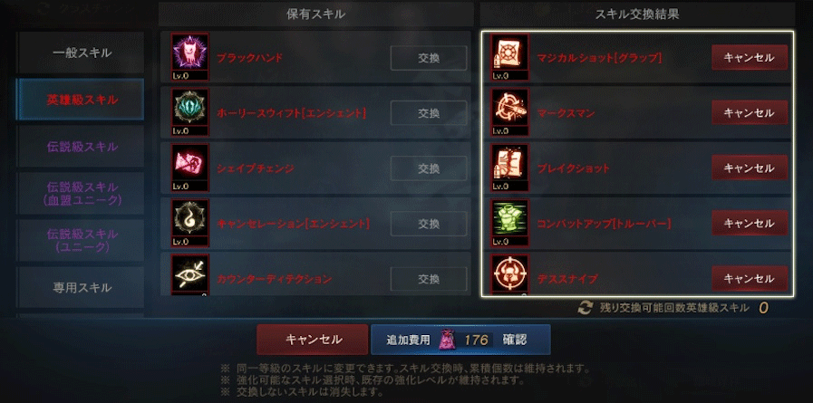 同様に「英雄級スキル」「伝説級スキル」も交換が可能です。