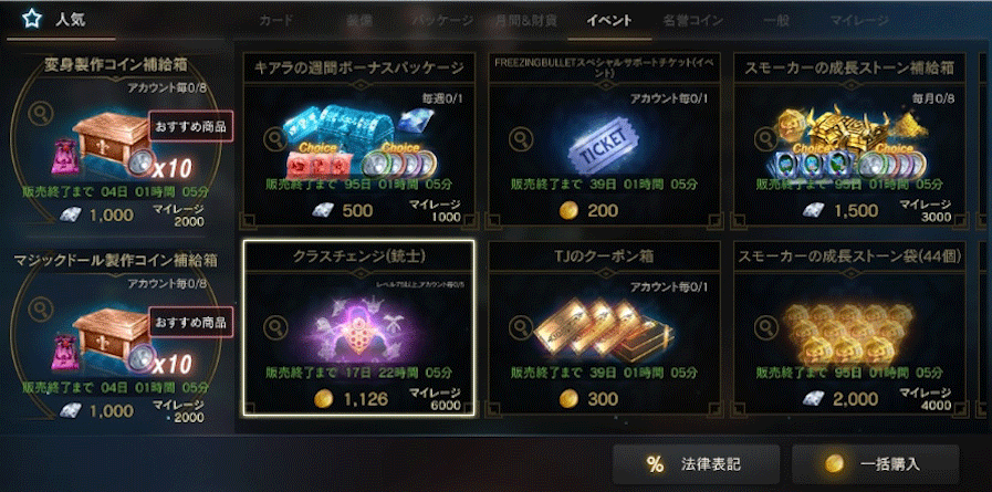STEP.1 メニュー > ショップ > イベントより、クラスチェンジ先の職業に対応したクラスチェンジ商品を選択してください。