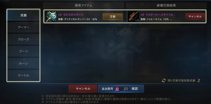 クラスチェンジを行う際に交換可能なアイテムは、希少級以上のクラスチェンジ前のキャラクターが装備可能なアイテムが対象となります。
