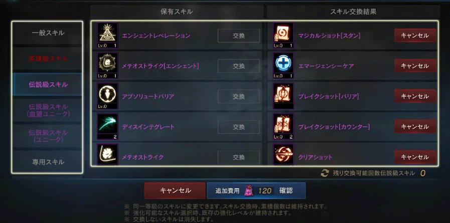 各職業ごとに、現在習得している「伝説級スキル(ユニーク)」のみを対象に、他職業の対応するスキルに交換が可能です。
