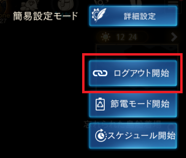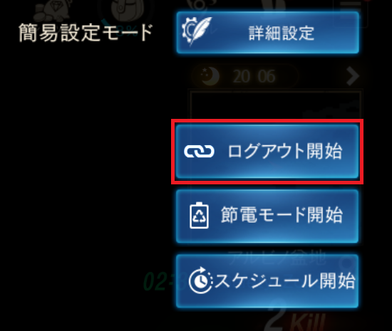 - ログアウトプレイの残り時間はスケジュール画面の「ログアウトプレイOFF」ボタンの下のテキストから確認可能です。