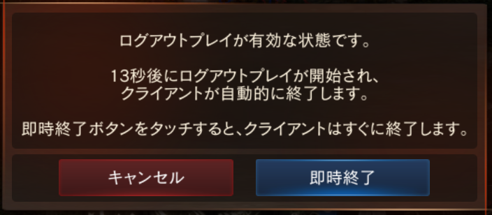 - ポップアップ内の「キャンセル」ボタンをタップすると、クライアントは終了せず、ログアウトプレイ待機状態でスケジュールが進行します。