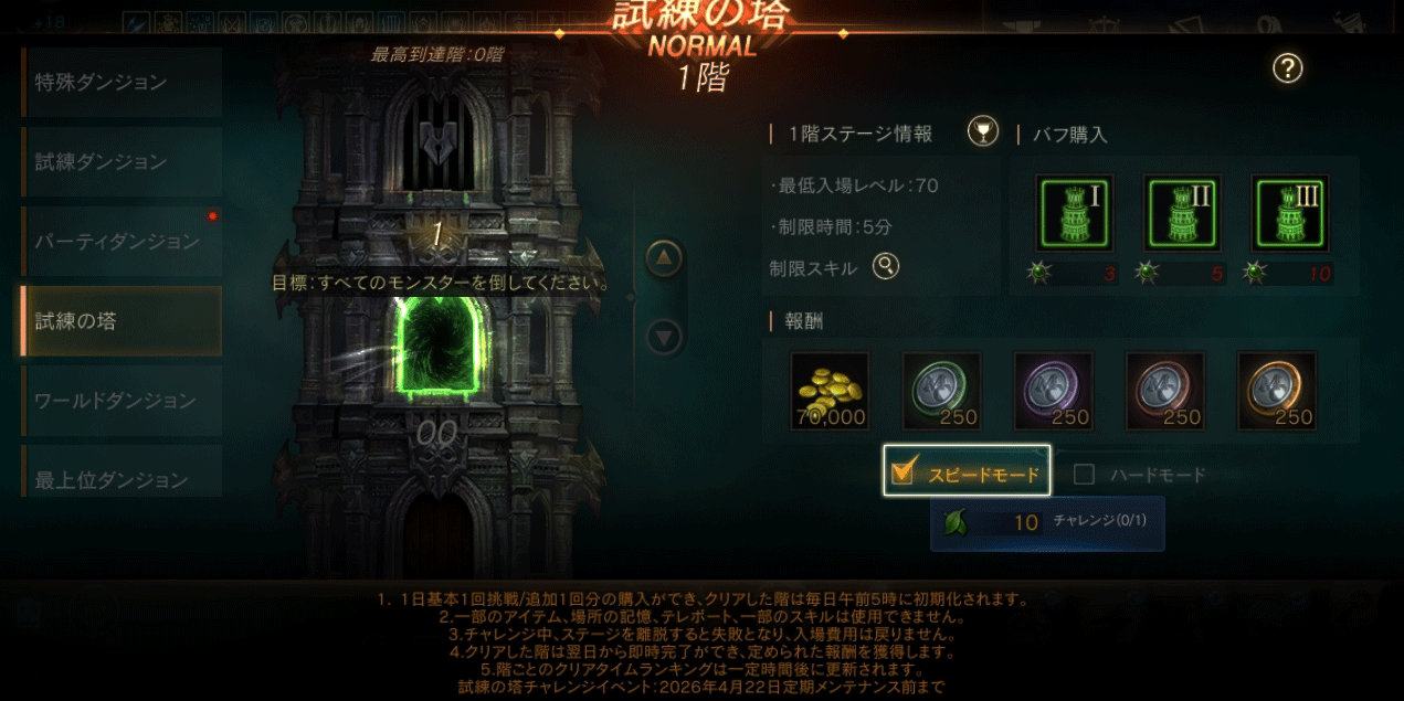 イベント期間中、レベル70以上のキャラクターでゲーム内メニューの「ダンジョン>試練の塔」より「試練の塔」に挑戦が可能になります。