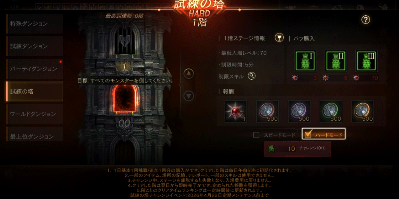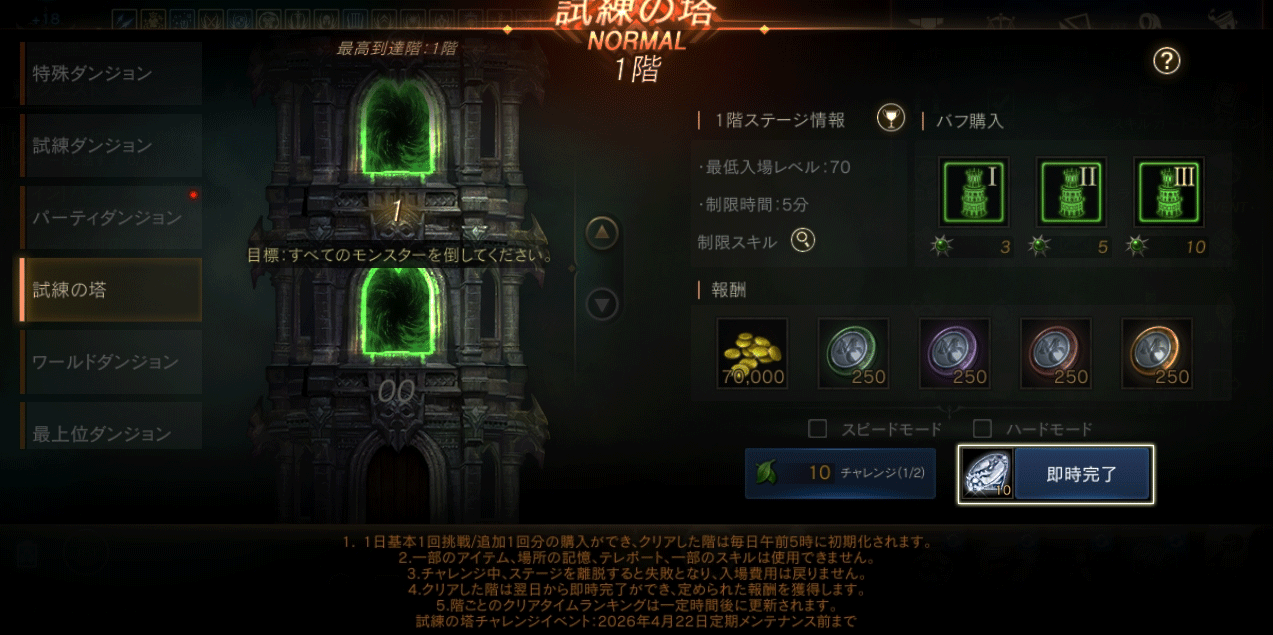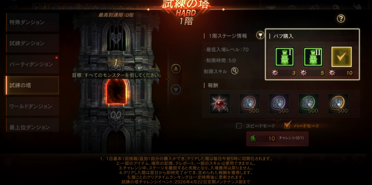 「試練の塔」はアカウントごとに通常モード/ハードモードそれぞれ1日1回挑戦可能なダンジョンで、「シーズンダンジョン」タブから入場可能できます。