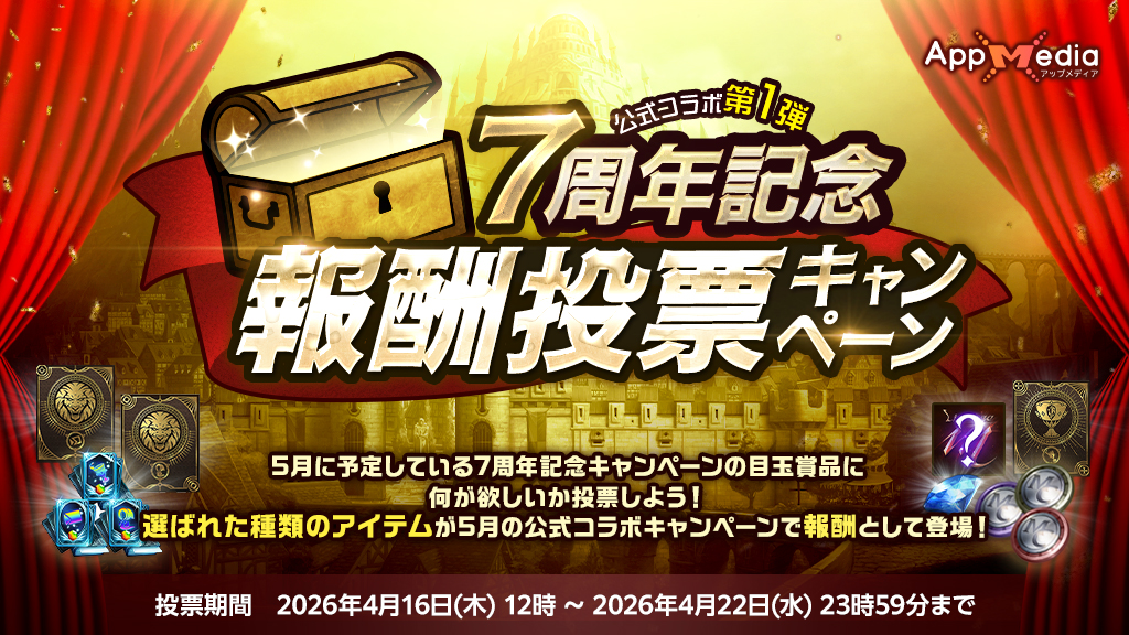 2026年4月16日(木)より攻略wiki「AppMedia」とのコラボレーションイベントとして「公式コラボ第1弾 7周年記念 報酬投票キャンペーン」を開催いたします。