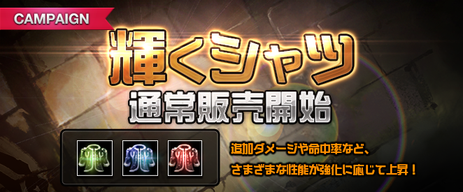 強化値によってさまざまな性能が上昇する防具「輝くシャツ」が通常販売開始と、通常販売開始を記念して期間限定で登場した特別なパッケージについてお知らせいたします。