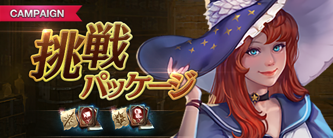 11回分のガチャ券と各種装備強化の巻物が獲得できる「挑戦パッケージ」についてお知らせいたします。