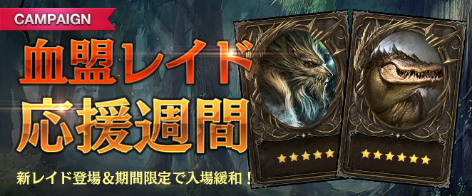血盟レイド「リカント」「ジャイアントクロコダイル」の追加を記念して、期間限定で血盟レイドの入場制限緩和を行うイベント「血盟レイド応援週間」を開催いたしますのでお知らせいたします。