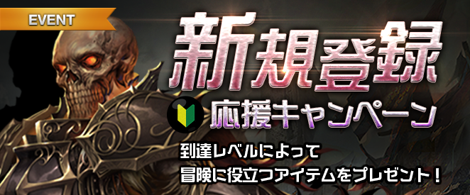 期間中、新規アカウントでキャラクターを育成して一定条件を達成すると、さまざまなアイテムが手に入るイベント「新規登録応援キャンペーン」についてお知らせします。