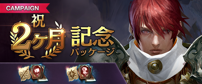 11回分のガチャ券と祝福された装備強化の巻物が獲得できる「祝2ヶ月記念パッケージ」についてお知らせいたします。