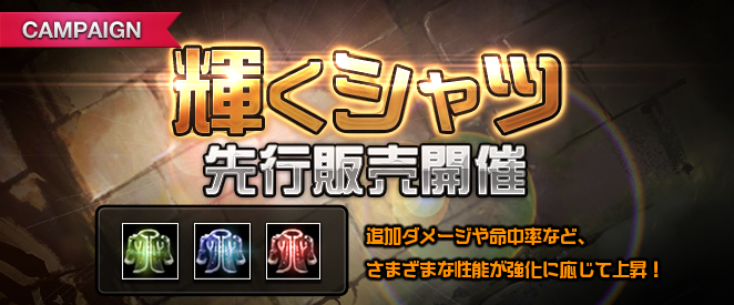 強化値によってさまざまな性能が上昇する防具「輝くシャツ」の先行販売についてお知らせいたします。